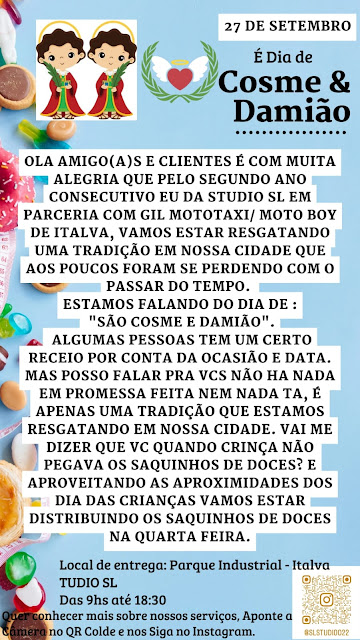 Redação setembro 27, 2023 0 180 São Cosme e Damião: Studio SL e Moto táxi Italva fazem distribuição de doces