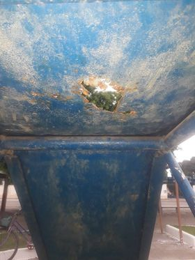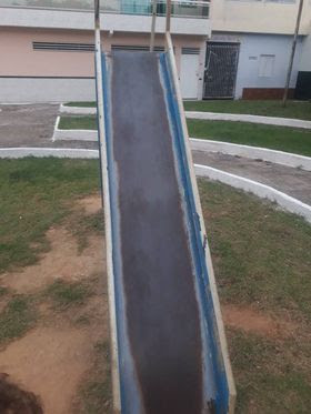 O escorregador de metal possui um buraco com ferrugem na parte superior, onde as crianças sentam antes de escorregar, o que pode causar ferimentos. Veja o detalhe na imagem abaixo. O mais prudente é evitar usar o aparelho até que seja feito o reparo.