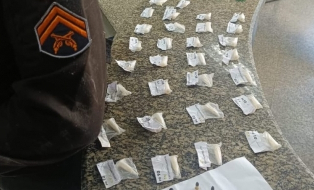 Ao chegarem ao local, os policiais seguiram uma trilha de mato amassado e encontraram um recipiente plástico com tampa enterrado. No interior do recipiente, foram encontradas 60 pedras de crack, 67 pinos de cocaína (avaliados em R$ 50 cada), 8 munições de calibre 22, 4 munições de calibre 38 e 9 munições de calibre 380.